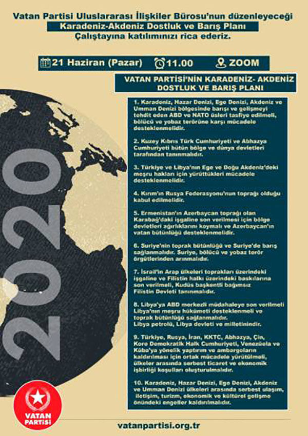 Vatan Partisi Uluslararası İlişkiler Bürosu, 21 Haziran 2020'de video konferans üzerinden Karadeniz- Akdeniz Dostluk ve Barış Planı Çalıştayı’nı düzenledi. Çalıştayda Karadeniz ve Akdeniz’deki bölge ülkelerinin ABD emperyalizmine karşı işbirliğinin nasıl sağlanacağı üzerine görüşler sunuldu. Vatan Partisi’nin hazırladığı 10 maddelik Karadeniz-Akdeniz Barış ve Dostluk Planı’nın hayata geçirilmesi tartışıldı.