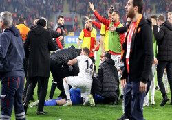 Sağlık ekipleri yaralıya müdahale ederken sahaya atlayan Göztepe taraftarı Mehmet Nihat Aydın, korner direğiyle rakip takımın kalecisi Ozan Evrim'e saldırdı.