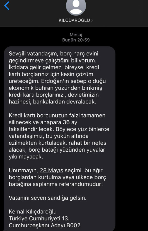 "Sevgili vatandaşım, borç harç evini geçindirmeye çalıştığını biliyorum. İktidara gelir gelmez, bireysel kredi kartı borçlarınız için kesin çözüm üreteceğim.