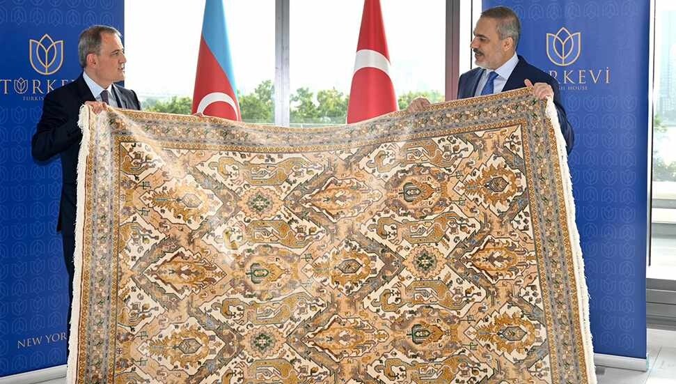 Azerbaycan Dışişleri Bakanı Ceyhun Bayramov, Türk Devletleri Teşkilatı (TDT) Dışişleri Bakanları Gayrıresmi Toplantısı'ndan sonra Türkevi'ne Karabağ halısı hediye etti.
