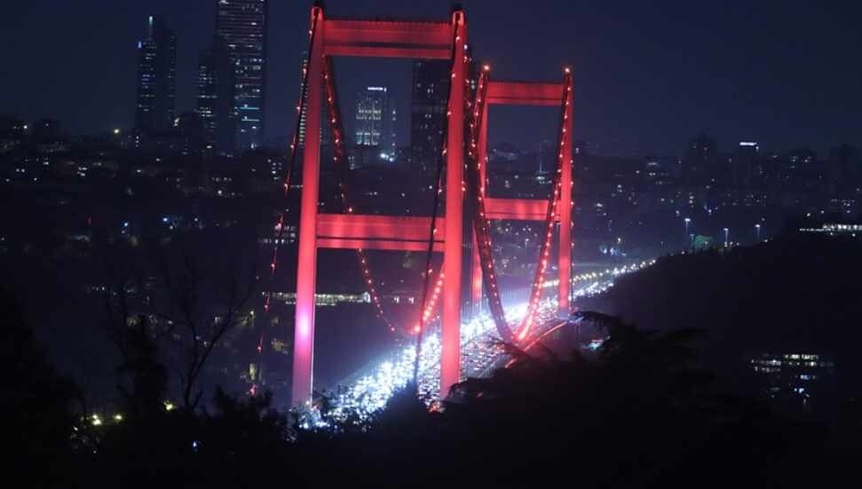 Önemli günlerde renk ve ışık gösterileriyle aydınlatılan yapılardan Fatih Sultan Mehmet (FSM) Köprüsü, kalp ve damar hastalıkları ile buna bağlı ölümlere dikkati çekmek için kırmızıya büründü.