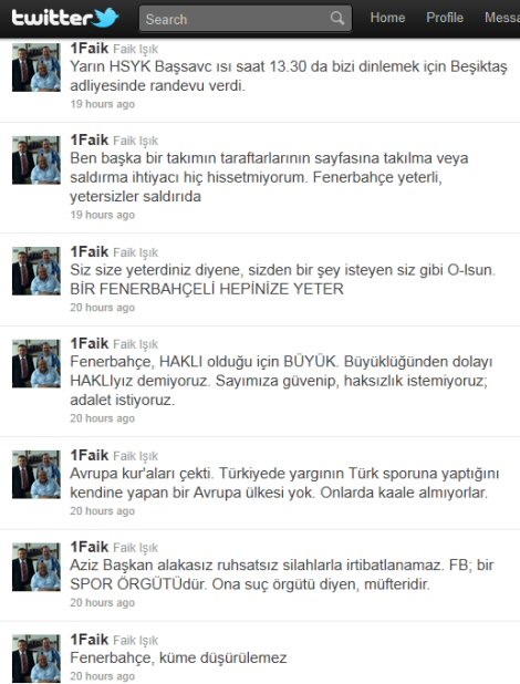 Aziz Yıldırım'ın avukatı Faik Işık, Twitter'dan yaptığı 'olay' açıklamalara bir yenisini daha ekledi. Futbolda şike soruşturması kapsamında tutuklanarak Metris Cezaevi'ne gönderilen Fenerbahçe Kulübü Başkanı Aziz Yıldırım'ın avukatlığını yapan Faik Işık, Twitter'dan iddialı açıklamalarda bulundu.