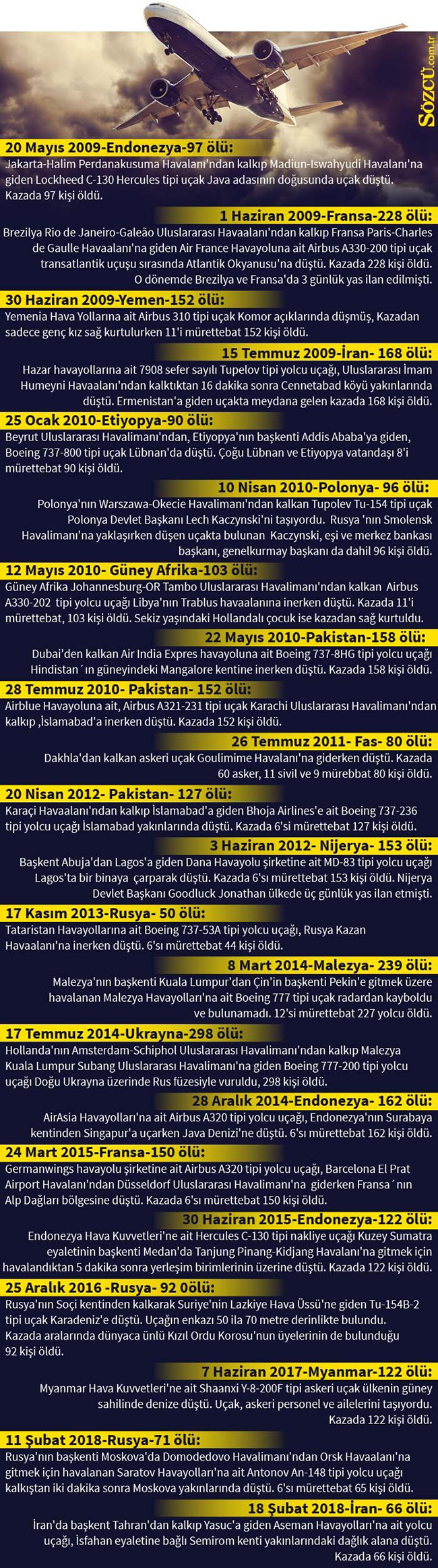 Günlük 11 bin uçak ile yaklaşık 2 milyon insanın kullandığı havayollarında üst üste meydana gelen uçak kazaları güvenilirlik tartışmalarını tekrar başlattı. 2009'dan bu yana meydana gelen 22 uçak kazasında 2 bin 976 kişi yaşamını yitirirken 2 kişi hayatta kaldı.