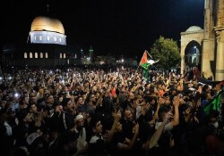 Doğu Kudüs’ün Eski Şehir bölgesinde bulunan Harem-i Şerif’te kılınan yatsı ve teravih namazlarının ardından Filistinli gençler Kıble Mescidi ile Kubbetu’s Sahra arasında toplandı.