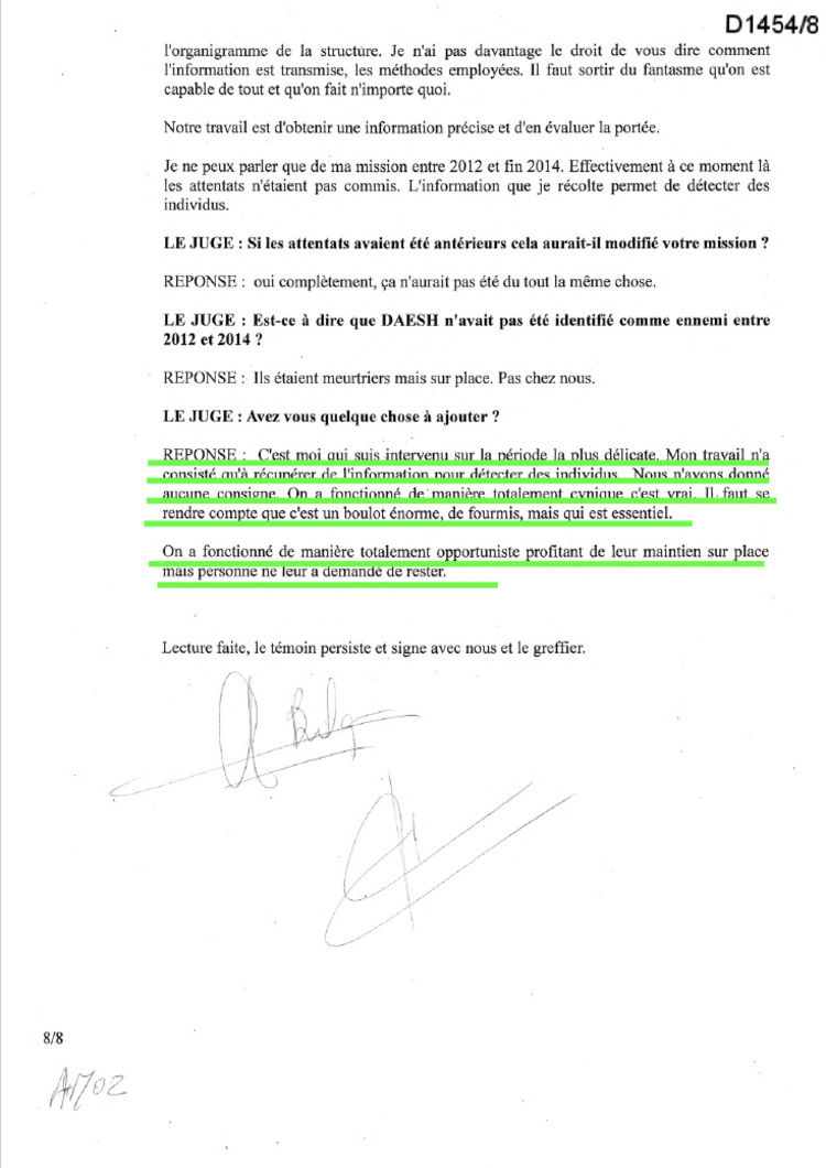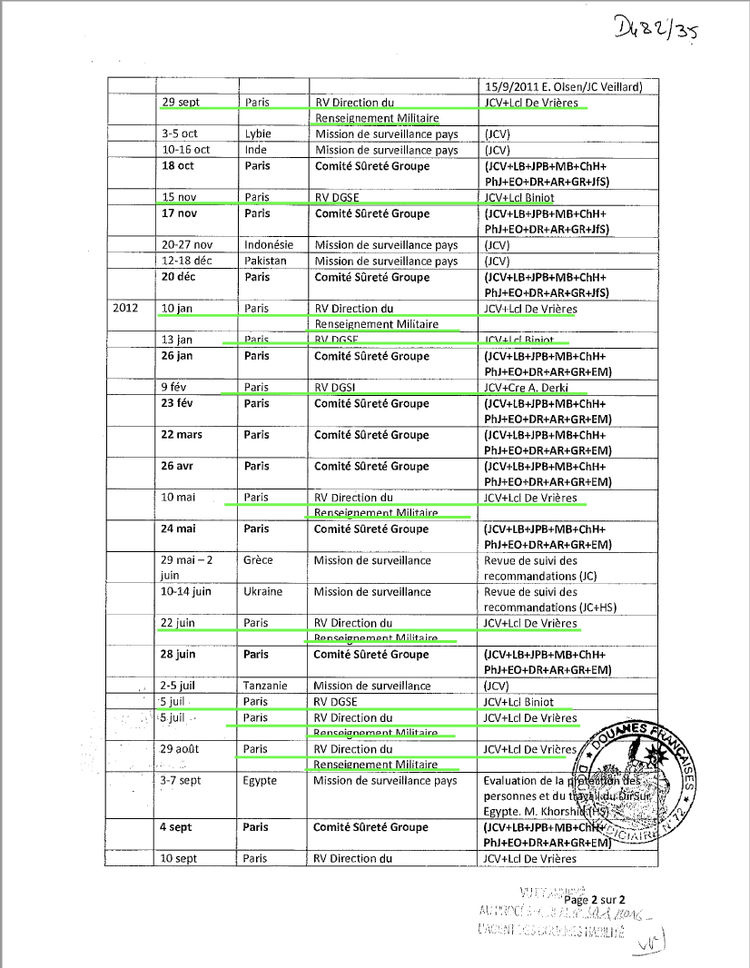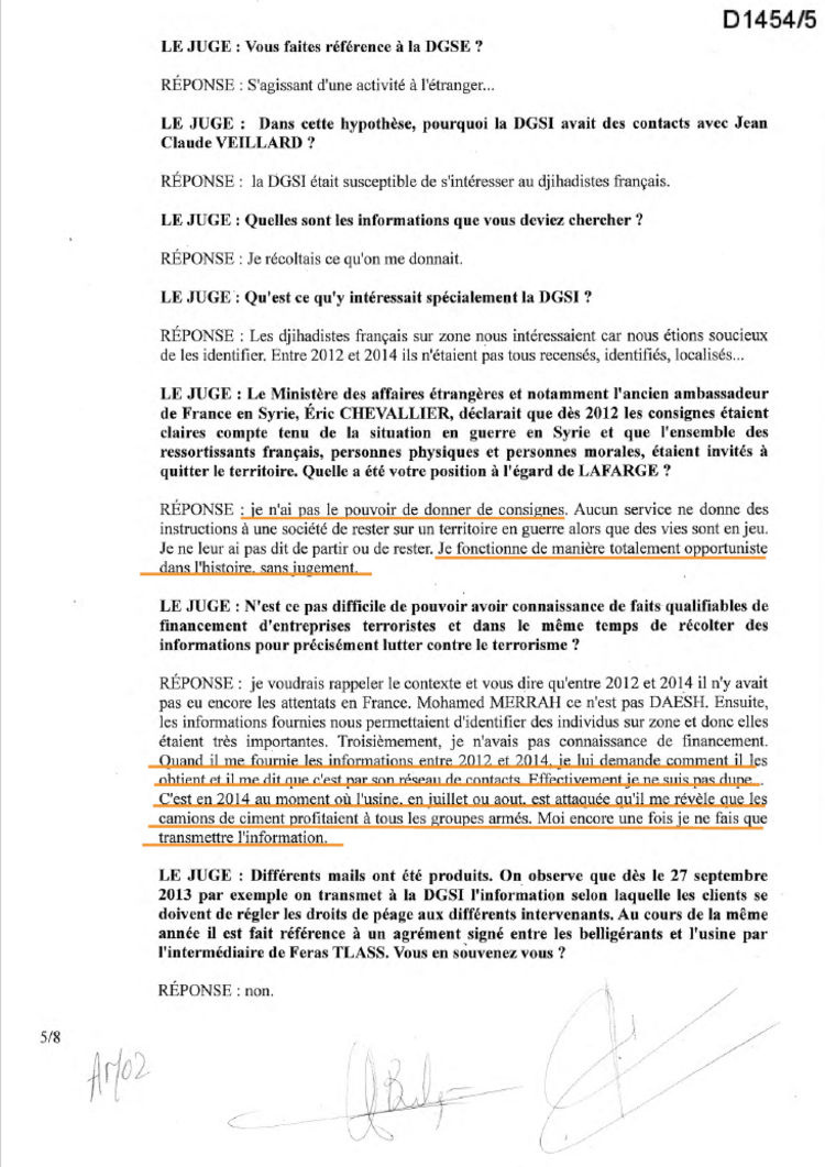 Belgelere göre, Lafarge, terör örgütü DEAŞ'la ilişkisi hakkında Fransız istihbarat servislerini sürekli bilgilendirdi. Fransız istihbarat ve devlet kurumları, Lafarge'ı terörü finanse ederek insanlığa karşı suç işlediği konusunda uyarmadı ve bu durumu gizli tutanaklarda itiraf etti. DEAŞ, Lafarge'dan aldığı çimentoları sığınak ve tünel yapımında kullandı.