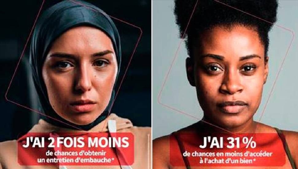 Fransa'da Grenoble Belediyesinin ayrımcılık karşıtı kampanyasında, başörtülü bir kadının bulunduğu afişlerde, "İş görüşmelerinde herkesten en az iki kat daha az şansım var" ifadesi kullanıldı.