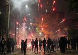 Olaylara müdahale etmek için yaklaşık 50 belediye polisi görevlendirilirken, yüzü maskeli gençler polise kaldırım taşları ve bir molotofkokteyli fırlattı.