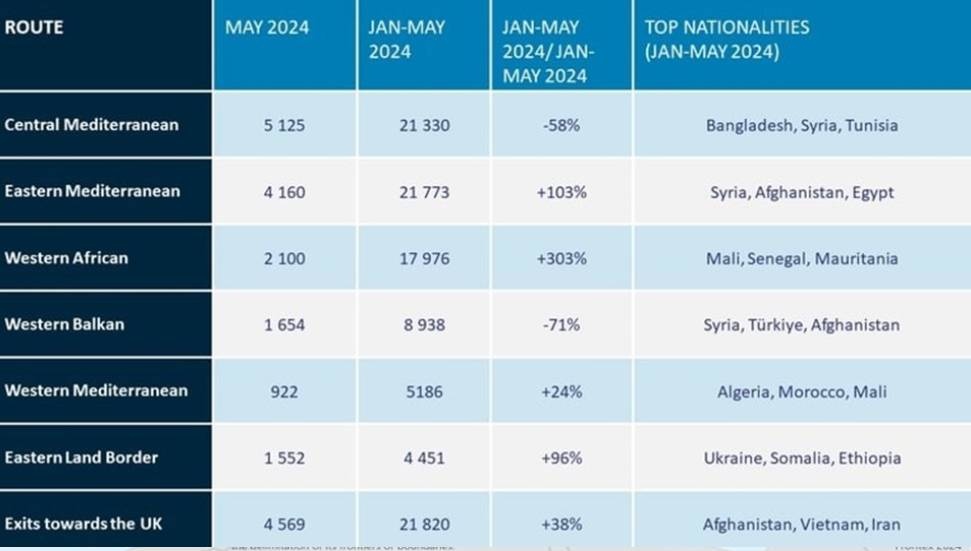 Orta Akdeniz’den geçişlerin yüzde 58 oranında düştüğünü vurgulayan Frontex, Batı Balkanlar sınırlarından geçişlerin ise yüzde 71 oranında düşüş görüldüğünü belirtti. Batı Afrika’dan ve Doğu Akdeniz’den geçişlerin önemli ölçüde arttığı belirtilirken bu yıl en fazla geçiş yapamaya çalışan kişilerin Suriye, Mali ve Afganistan’dan olduğu ifade edildi.