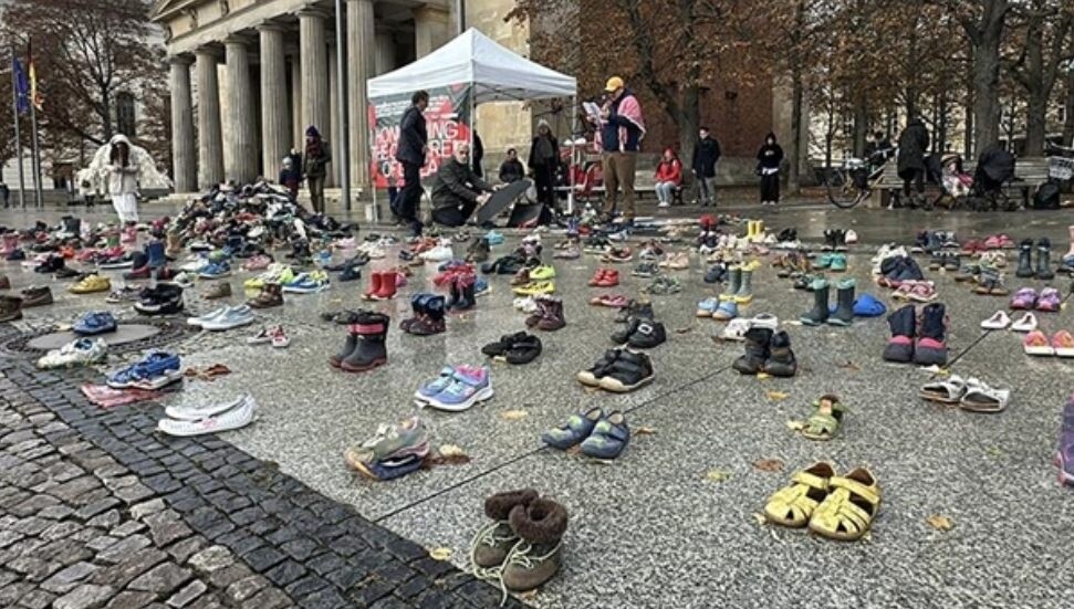 Gösteride ölen çocukların isimleri okundu ve Unter den Linden Caddesi’nin kaldırımına Gazze’deki soykırıma dikkati çekmek için yüzlerce çift çocuk ayakkabısı bırakıldı.