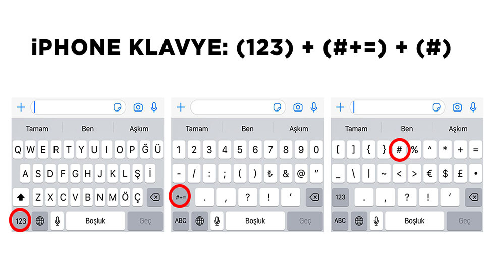 İOS işletim sistemli bir İphone’a sahipseniz, sanal klavyenin sol alt kısmında bulunan (123) butonuna dokunmanız, ardından (#+=) butonuna dokunmanız ve son olarak açılan ekranda kare işaretine (#) dokunmanız gerekiyor.