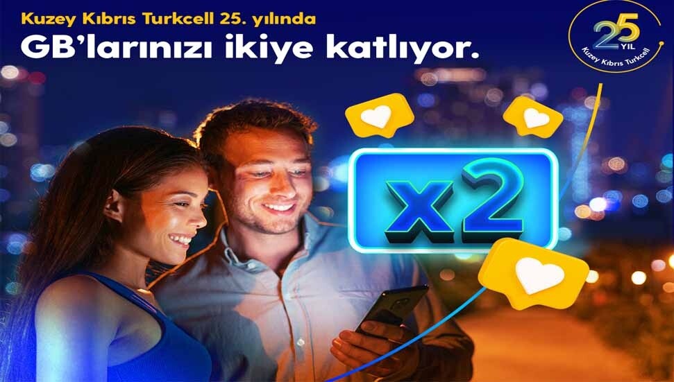 Kuzey Kıbrıs Turkcell, 25. yılına özel bir kampanya duyurdu. Bu özel kampanya ile Turkcell’in yüksek hızını ve güçlü internet altyapısını dolu dolu yaşamak isteyen müşterilerine iki katı internet sunuyor. Kampanya kapsamında Kuzey Kıbrıs Turkcell’liler, paketlerindeki interneti ikiye katlayarak internette kesintisiz bir deneyim yaşıyor.