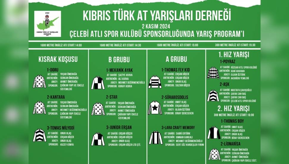 Çelebi Atlı Spor Kulübü sponsorluğunda koşulacak yarışlar 1600 metre Kısrak Koşusu, B ve A Grubu koşularından sonra, adada ilk defa koşulacak olan 300 metre hız yarışları yapılacak.