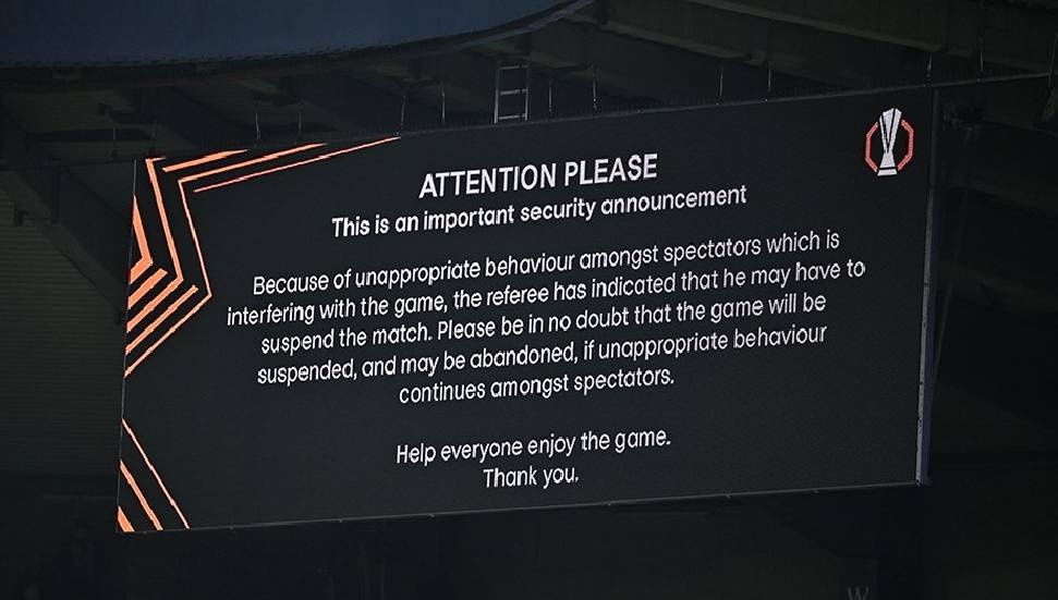 Stat ekranlarında bu sırada "Bazı seyircilerin maçı olumsuz etkileyen ırkçı davranışları nedeniyle hakem maçı durdurmak zorunda kalabileceğini belirtmiştir. Seyircilerin ırkçı davranışlara devam etmesi durumunda maçın durdurulacağından ve tatil edilebileceğinden kuşkunuz olmasın." ifadesi yer aldı.