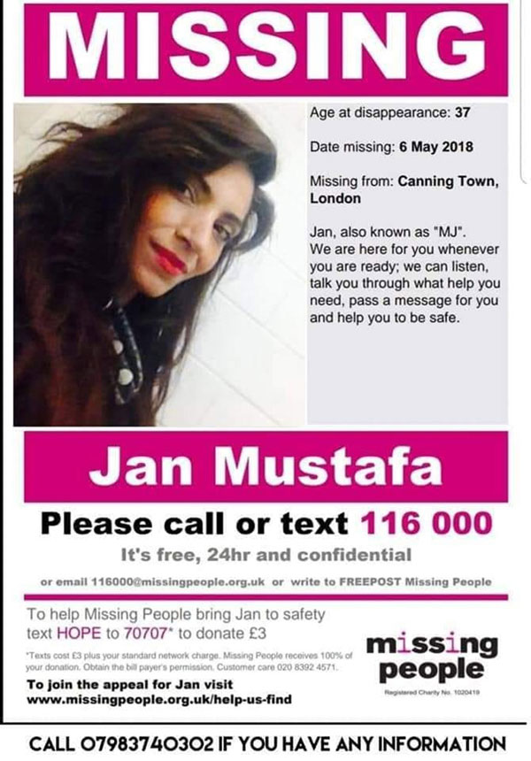Mustafa ailesi Canan Mustafa'yı gören ya da yerini bilenlerin insanlık adına 07983 740302'yi ya da 101 numaralı "Kayıp Aranıyor" hattını aramalarını istedi.