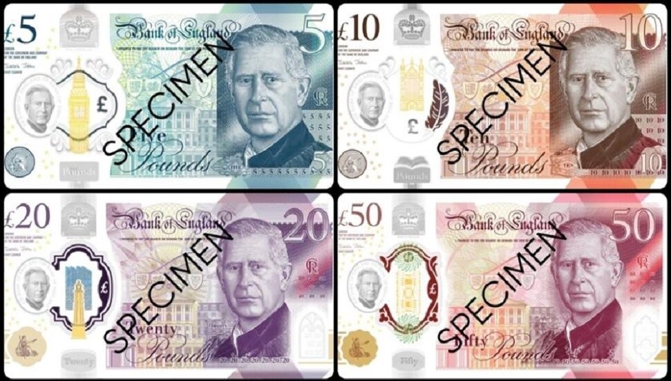 İngiltere Kralı 3. Charles'ın portresinin bulunduğu 5,10, 20 ve 50 poundluk banknotların basım halinde olduğu ve 2024'ün ortasında dolaşıma gireceği bildirildi.