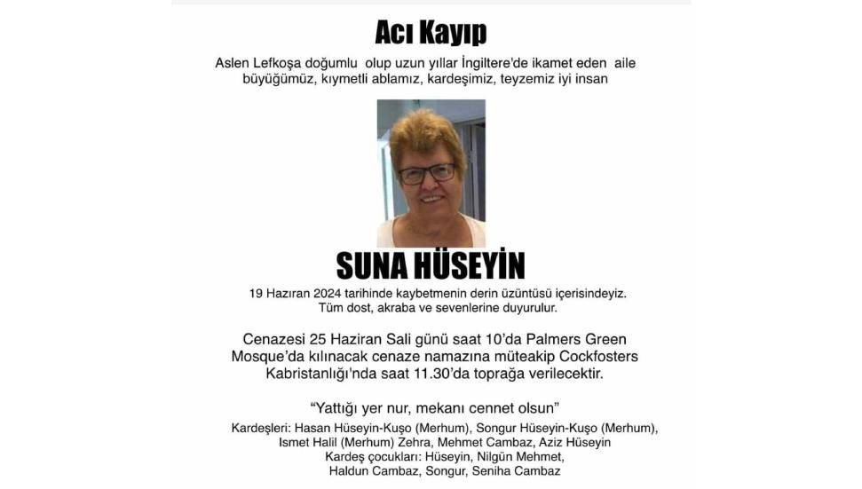 Aslen Lefkoşa doğumlu olan ve uzun süredir İngiltere’de ikamet eden Suna Hüseyin, hayatını kaybetti.