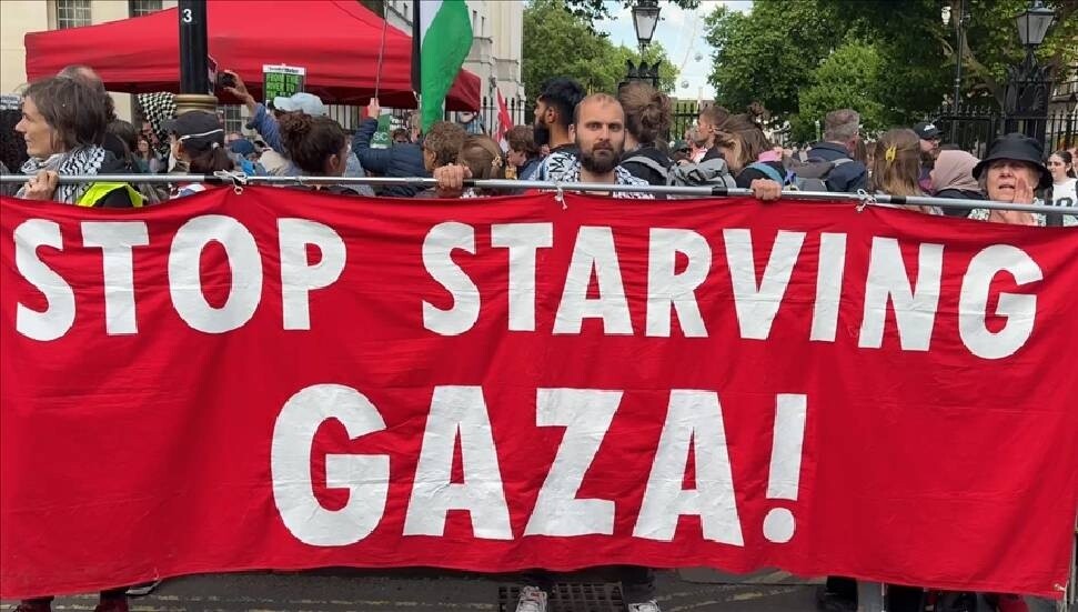 Göstericiler, İngiltere Başbakanı Keir Starmer ve Dışişleri Bakanı David Lammy'e tepki göstererek "Starmer, Lammy, saklanamazsınız. Sizi soykırımla yargılayacağız" sloganları attı.