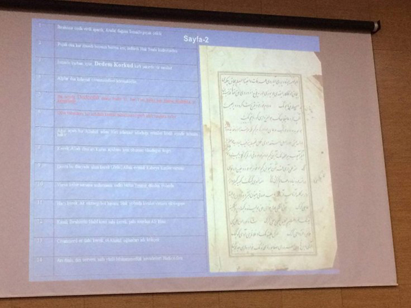 Prof. Dr. Metin Ekici, üçüncü nüshanın 12 hikaye (destan) içeren Dede Korkut Kitabı'nın 13. destanını da içerdiğini söyledi. Ege Üniversitesi Türk Dünyası Araştırmaları Enstitüsü Türk Folklorü Anabilim Dalı Başkanı Prof. Dr. Metin Ekici, sempozyumda yaptığı sunumda Dede Korkut'un 3. nüshasına ait sayfaları da paylaştı.