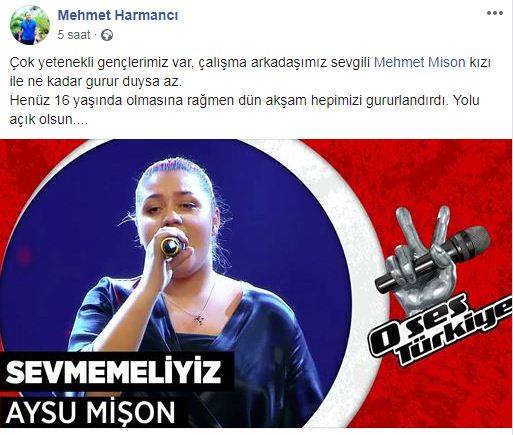 TV 8'de yayınlanan ve ülkemizden de yerli müzisyenlerimizin yoğun ilgi gösterdiği "O Ses Türkiye" isimli yarışmaya katılan Aysu Mişon'un performansı büyük beğeni topladı.
