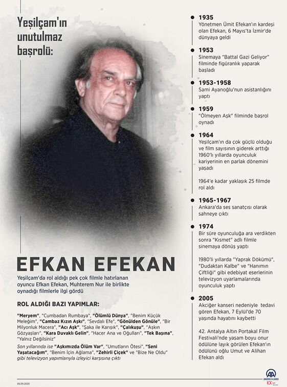 Sinemaya 1953'te "Battal Gazi Geliyor" filmiyle başlayan, Muhterem Nur ile birlikte oynadığı filmlerle ilgi gören ve çok sayıda Yeşilçam filminde başrol oynayan oyuncu Efkan Efekan'ın ölümünün üzerinden 15 yıl geçti.