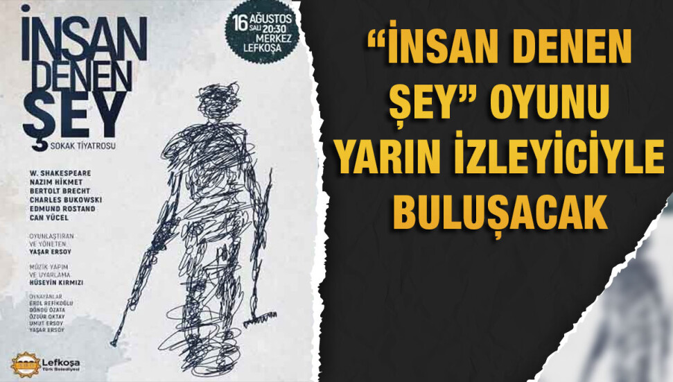 Sokak Tiyatrosu ekibinin tek perdelik yeni oyunu “İnsan Denen Şey” yarın Lefkoşa açık pazar alanında sahnelenecek. Lefkoşa Türk Belediyesi'nden verilen bilgiye göre, etkinlik saat 20.30’da başlayacak, ve ücretsiz olacak.