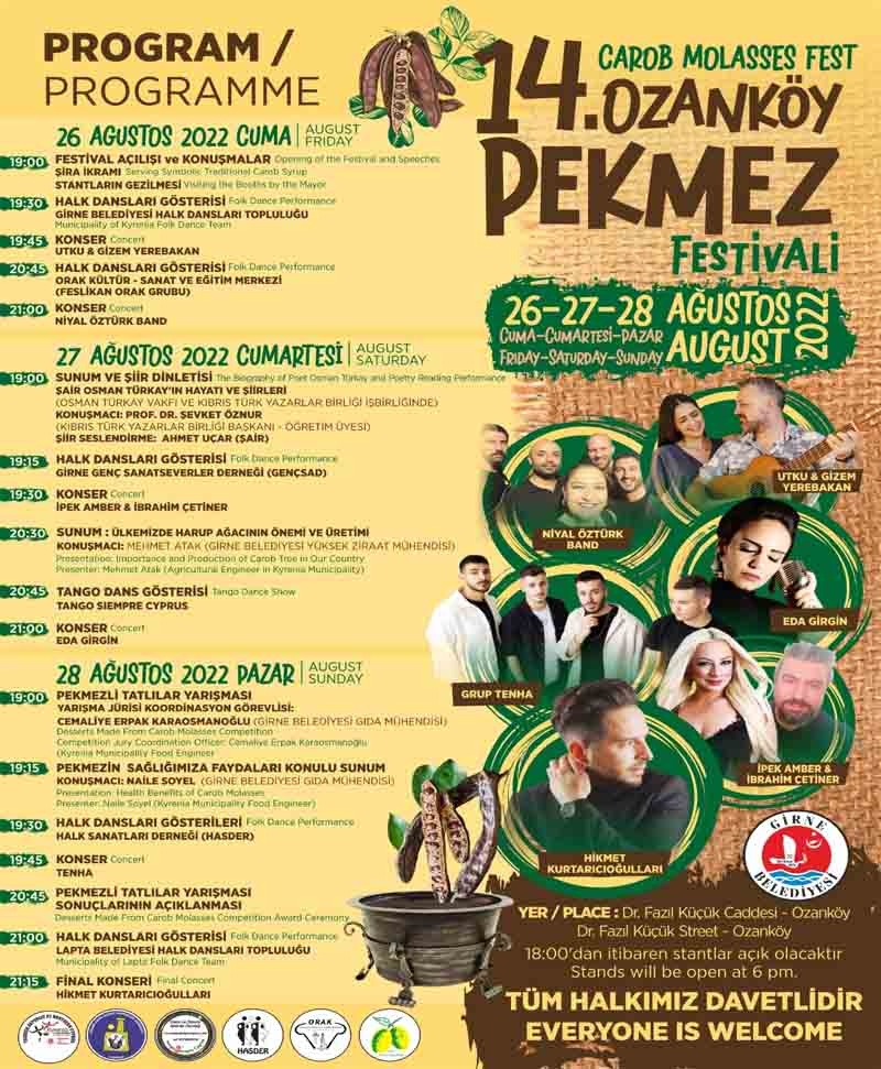 27 Ağustos Cumartesi: 19.00 Sunum ve Şiir Dinletisi, Şair Osman Türkay’ın Hayatı ve Şiirleri (Konuşmacı Prof. Dr .Şevket Öznur (Kıbrıs Türk Yazarlar Birliği Başkanı – Öğretim Üyesi), Şiir Seslendirme Ahmet Uçar ( Şair) ( Kıbrıs Türk Yazarlar Birliği ve Osman Türkay Vakfı İşbirliğinde ) 19.15 Halk Dansları Gösterisi, Girne Genç Sanatseverler Derneği, 19.30 Konser İpek Amber & İbrahim Çetiner; 20.30 “Ülkemizde Harup Ağacının Önemi ve Üretimi” Konuşmacı: Mehmet Atak ( Girne Belediyesi Yüksek Ziraat Mühendisi); 20.45 Tango Dans Gösterisi Tango Siempre Cyprus, 21.00 Konser Eda Girgin.
