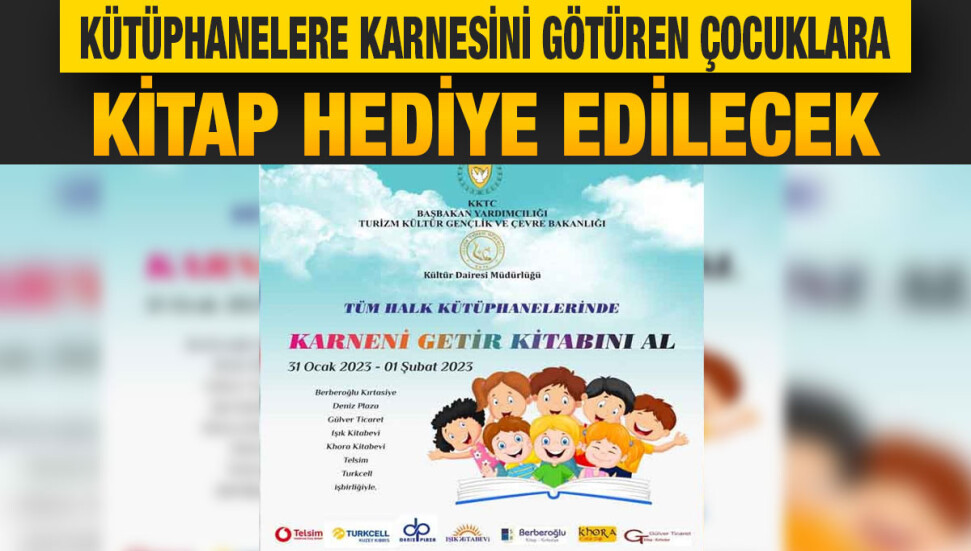 Kültür Dairesi’nin, Berberoğlu Kırtasiye, Deniz Plaza, Gülver Ticaret, Işık Kitabevi, Khora Kitap ile Telsim ve Kuzey Kıbrıs Turkcell’in katkılarıyla tüm kütüphanelerinde gerçekleştireceği “Karneni Getir Kitabını Al” etkinliği, 31 Ocak Salı gün başlatılıp 3 Şubat Cuma gününe kadar bir hafta boyunca devam edecek.