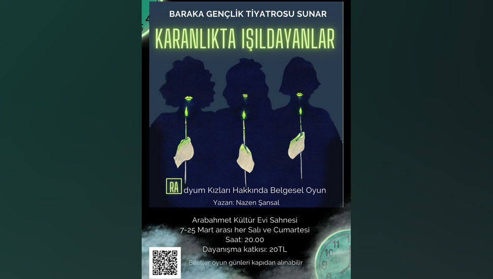 Baraka Tiyatro Ekibi kolaylaştırıcısı Nazen Şansal tarafından kaleme alınan “Karanlıkta Işıldayanlar” oyunu, saat kadranlarını radyumlu boyayla boyayan ve bu sebeple sağlık sorunları yaşayan genç işçi kızların yaşam öyküsünü ve patronlara karşı mücadelesini anlatıyor.