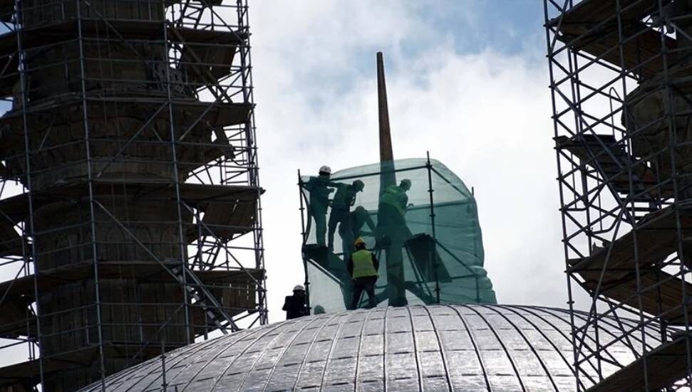 Yaklaşık 700 kilogram ağırlığında, 6 metre 30 santimetre yüksekliğindeki alem, kubbeye taşınarak yerinde montajlanıyor.