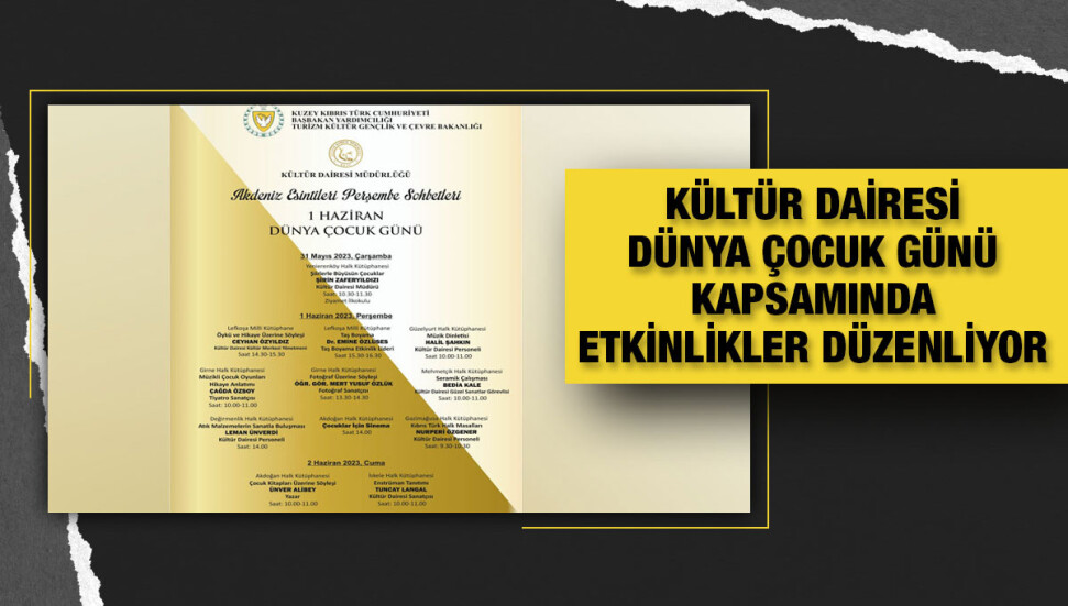 Başbakan Yardımcılığı, Turizm, Kültür, Gençlik ve Çevre Bakanlığı’na bağlı Kültür Dairesi, 1 Haziran Dünya Çocuk Günü’nü çocuklarla birlikte kütüphanelerde kutluyor. Kültür Dairesi, Akdeniz Esintileri Perşembe Sohbetleri kapsamında, 1 Haziran Dünya Çocuk Günü başlığıyla Daire bünyesinde faaliyet gösteren Milli Kütüphane ve tüm halk kütüphanelerinde etkinlikler düzenliyor.