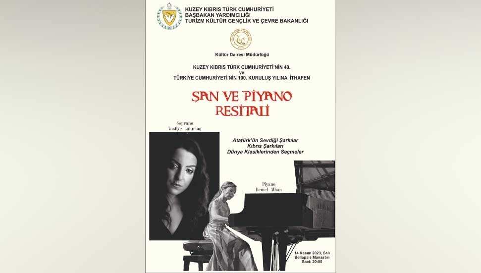 Başbakan Yardımcılığı Turizm, Kültür, Gençlik ve Çevre Bakanlığı’na bağlı Kültür Dairesi, Kuzey Kıbrıs Türk Cumhuriyeti’nin 40’ncı ve Türkiye Cumhuriyeti’nin 100’üncü kuruluş yılına ithafen şan ve piyano resitali düzenliyor.