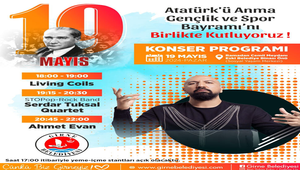 Girne'de, 19 Mayıs Atatürk'ü Anma, Gençlik ve Spor Bayramı dolayısıyla, 19 Mayıs Pazar günü Ramadan Cemil Meydanı'nda çeşitlik etkinlikler düzenlenecek.