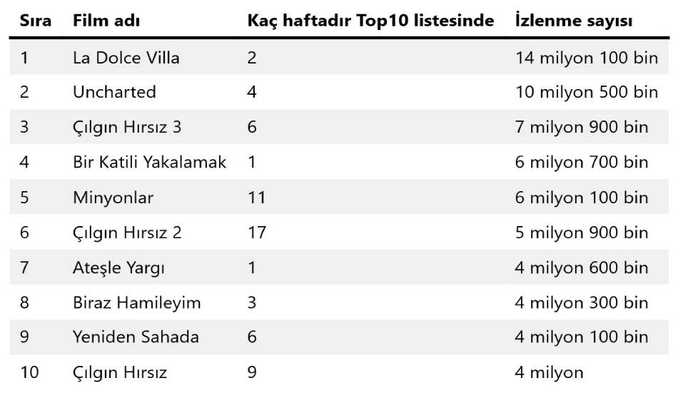 Netflix’in paylaştığı listeye baktığımızda ilk sırada La Dolce Villa’yı görüyoruz. Toplamda 14 milyon 100 bin kişinin izlediği film, iki haftadır Top10 listesinde. İkinci sırada ise 10 milyon 500 bin defa izlenen Uncharted yer aldı.