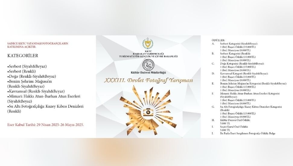 Açıklamada, ödül töreni ve sergi açılışının 19 Ağustos Dünya Fotoğrafçılık Günü’nde, Lefkoşa’da Kültür Dairesi’nin belirleyeceği bir sergi salonunda yer alacağı belirtildi.