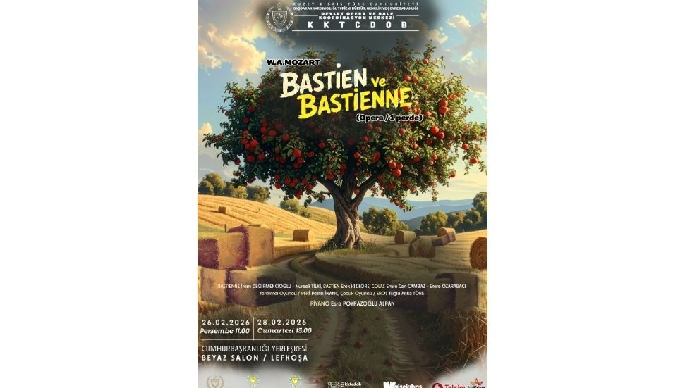 Wolfgang Amadeus Mozart’ın 12 yaşında bestelediği “Bastien ve Bastienne” operası, KKTCDOB tarafından tamamen Türkçeleştirilmiş haliyle çocuklar ve gençler için sahnelenecek. Ücretsiz temsiller 26 ve 28 Şubat’ta Cumhurbaşkanlığı Yerleşkesi Beyaz Salon’da izlenebilecek.