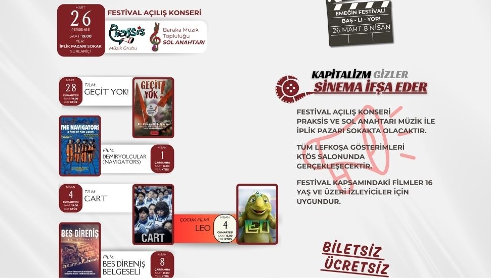 Festival kapsamında sinema gösterimlerinin ise 28 Mart akşamı “Geçit Yok!” filmiyle başlayacağı, ardından sırasıyla Demiryolcular ve Cart filmlerinin izleyiciyle buluşacağı belirtildi. Festivalin son gecesinin ise BES Direniş Hikayesi adlı belgesel ile tamamlanacağı bildirildi. Tüm gösterimlerin Kıbrıs Türk Öğretmenler Sendikası Salonu’nda saat 19.00’da başlayacağı ifade edildi.