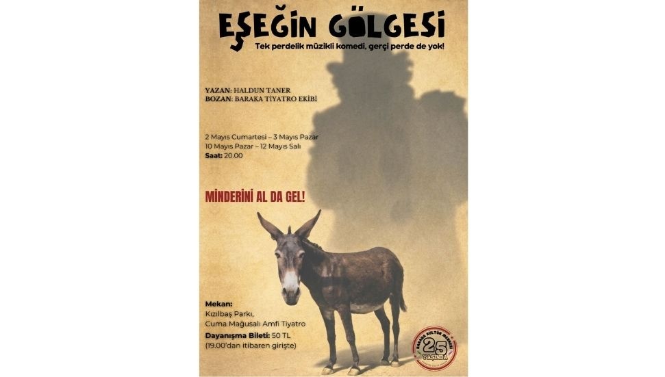 Baraka Tiyatro Ekibi’nin sahneye uyarladığı “Eşeğin Gölgesi”, 2-12 Mayıs tarihleri arasında Kızılbaş Parkı Amfi Tiyatro’da izleyiciyle buluşacak. Oyun, güncel toplumsal ve politik eleştirileri mizahi bir dille sahneye taşıyacak.