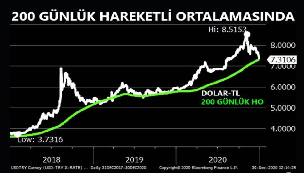 Dolar/TL kuru 7,30 seviyelerine kadar geriledi. Böylelikle dolar/TL kuru 200 günlük hareketli ortalamasını gördü.