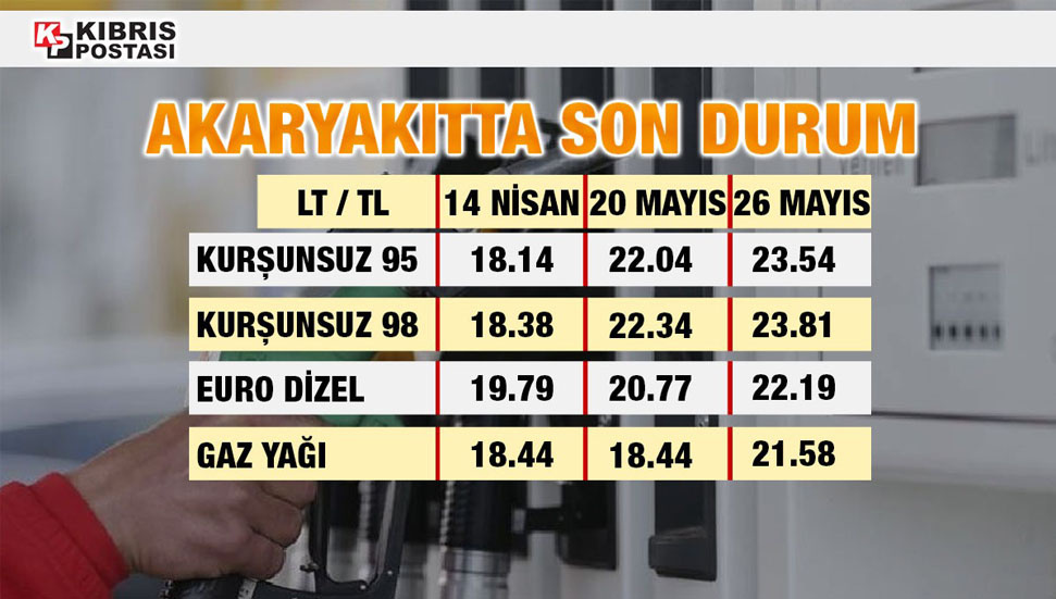 Buna göre kurşunsuz 95 oktan benzinin fiyatı 18,69’dan 23,54’e, kurşunsuz 98 oktan benzinin fiyatı 18,90’dan 23,81’e, dieselin fiyatı 17,62’den 22,19’a ve gazyağının fiyatı da 17,13’ten 21,58’e yükseldi.
