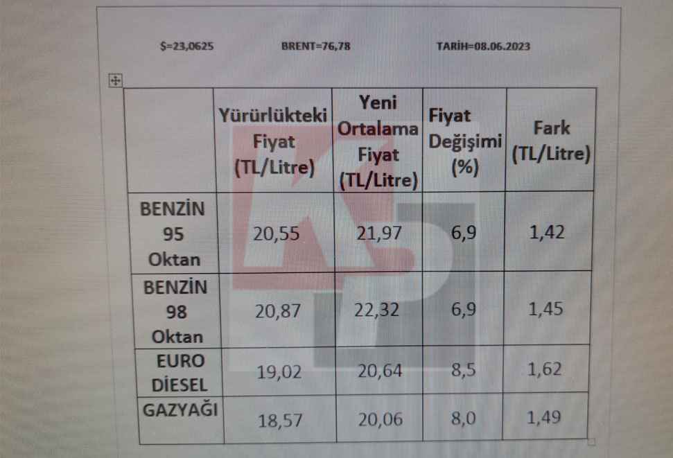 Kıbrıs Postası’nın Ekonomi ve Enerji Bakanlığı’ndan elde ettiği bilgiye göre, 95 oktan oktan benzin 20,55 TL’den 21,97 TL’ye, 98 oktan benzin 20,87 TL’den 22,32 TL’ye, Euro Dizel 19,02 TL’den 20,64 TL’ye ve gaz yağı 18,57 TL’den 20,06 TL’ye yükseldi.
