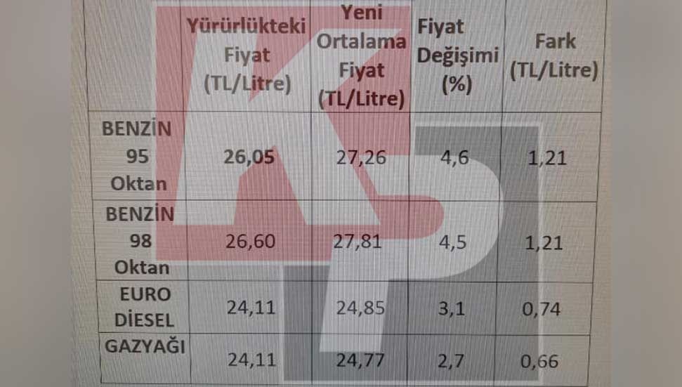 Resmi Gazete'de yayımlanan karar uyarınca 95 oktan benzin 27.26 TL, 98 oktan benzin 27.81 TL, Euro Dizel 24.85 TL, gazyağı 24.77 TL’den satışa sunulacak.