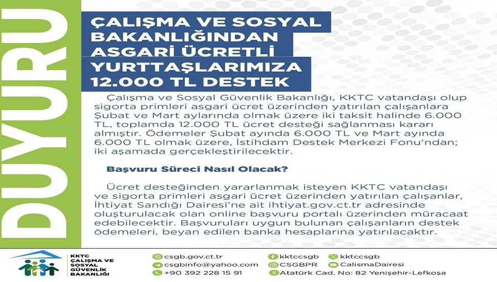 Çalışma ve Sosyal Güvenlik Bakanlığı, asgari ücretle çalışan KKTC vatandaşlarına yönelik 12 bin TL’lik ücret desteği sağlanmasına karar verdi.