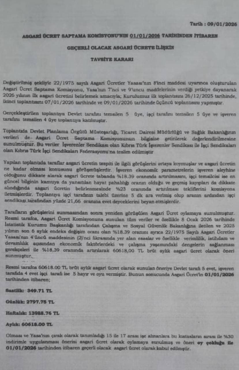 “Yapılan toplantıda taraflar asgari ücretin tespiti ile ilgili görüşlerini ortaya koymuşlar ve asgari ücretin ne kadar olması konusunu görüşmüşlerdir. İşveren ekonomik parametrelerin işveren aleyhine olduğunu dikkate alarak asgari ücrete tabanda %18,39 oranında artırılmasını, işçi temsilcisi ise en güncel bilginin kamuyu da yansıtan hayat pahalılığı oranı olduğu ve geçmiş kayıpları da dikkate alındığında asgari ücretin belirlenmesinde %23 oranında artırılması tekliflerini komisyona iletmişlerdir. Toplantıya işçi tarafının talebi üzerine 5 dk ara verilmiş olup aranın ARDINDAN İŞÇİ SENDİKASI TARAFINDAN YÜZDE %21,66 ORANINA EVET DİYECEKLERİNİ BEYAN etmişlerdir.”