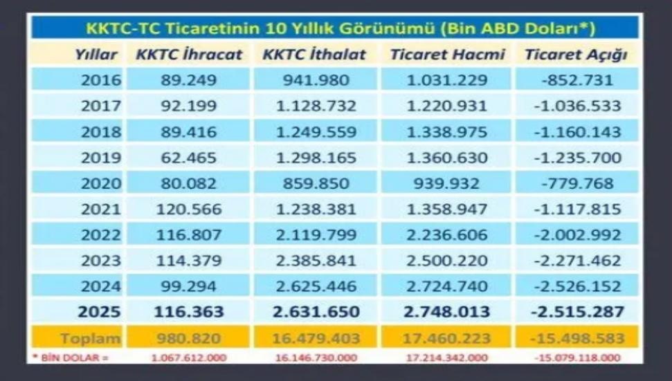 Gıynık Gazetesi’nden Artun Çağa’nın derlediği verilere göre, KKTC, 2025 yılında Türkiye’ye yalnızca 116 milyon 363 bin dolarlık mal satarken, Türkiye’den 2 milyar 631 milyon 650 bin dolarlık mal aldı. Bu tabloyla iki ülke arasındaki toplam ticaret hacmi 2 milyar 748 milyon 13 bin dolara ulaştı ve tüm zamanların en yüksek seviyesine çıktı. TÜİK verilerine göre, 2025 yılı hem ticaret hacmi hem ithalat hem de ticaret açığı bakımından rekorların kırıldığı bir yıl oldu.