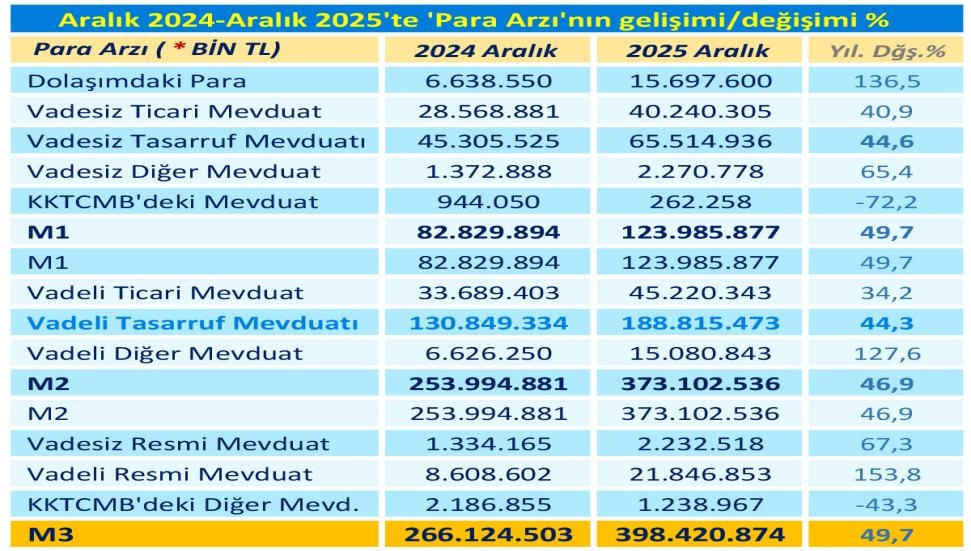 Aynı verilere göre ekonomide kullanılabilecek toplam para miktarını gösteren para arzı (M3), 2025 sonunda 398 milyar 420 milyon 874 bin TL’ye ulaşarak rekor kırdı. Merkez Bankası verileri para arzının yıllık bazda %49.7 oranında artarak %39.4’lük enflasyonun yaklaşık 10 puan üzerine çıktığını ortaya koydu. 2024 sonunda 266 milyar 124 milyon 503 bin TL olan M3, yıl boyunca her çeyrekte yükseldi.
