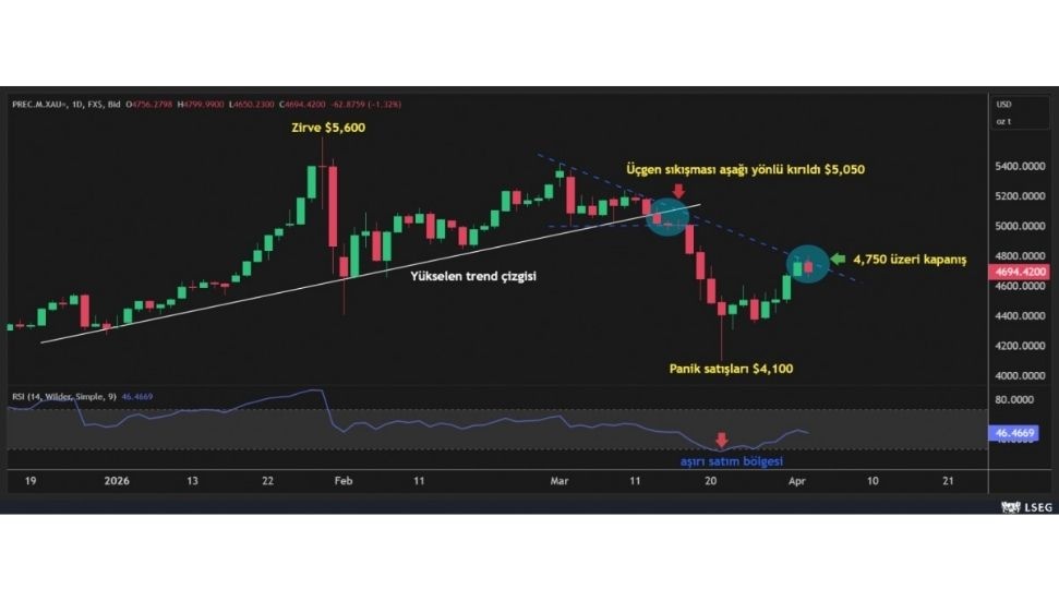 Olası bir ateşkes ihtimalini önden fiyatlayan piyasalarda son iki günde esen iyimserlikle hisse senetlerine alım gelirken, savaş döneminde değer kazanmasını beklediğimiz altın, panik işlemlerinin geride kalması ardından risk iştahını fiyatlayarak yükselişe geçti. Ne garip değil mi? Ne var ne yok sat paniğinin gölgesinde ABD tahvillerine gelen satış baskısıyla hafta başı yüzde 4,50 seviyesine dayanan 10 yıllık gösterge tahvil, dün 25 baz puan kadar gevşedi. Benzer bir şekilde, teknik mânâda 5,050 dolar seviyesinin kırılması ile çok süratli bir şekilde ve panik satışlarıyla 1,000 dolar kadar gerileyen altının ons fiyatı 4,100 dolar seviyesinden yönünü yukarıya çevirerek dün 4,800 dolar seviyesine kadar yükseliş kaydetti. Mahallenin sert çocuğu gümüş 76 dolar seviyesine kadar toparlanırken, bir diğer değer saklama aracı olan bitcoin ise 70 bin dolar seviyesinin etrafındaki dar bantta sıkışma isteğini korumaya devam ettiğini görüyoruz.