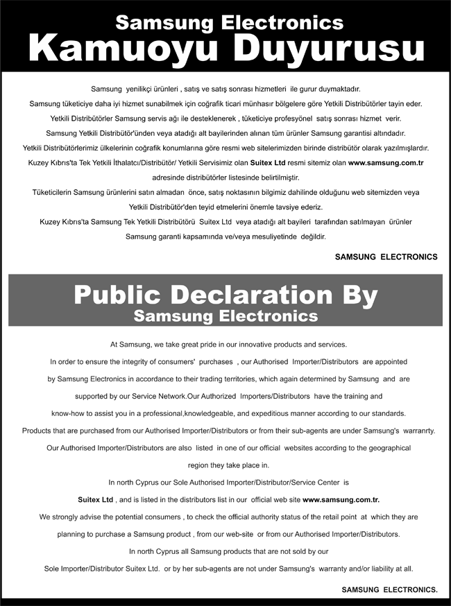 Samsung Electronics yayınladığı kamuoyu açıklamasında tüketiciyi bilinçlendirmek amacıyla aşağıdaki kamuoyu duyurusunu yayınlamıştır. Kamuoyunda yaşanan sıkıntıları ve müşteri mağduriyetlerini gidermek amacıyla böyle bir duyuruya ihtiyaç duyulduğunu belirten Samsung Electronics yetkilileri, piyasada paralel ithalat olarak tabir edilen spot piyasadan menşei ve garantisi belli olmayan ürünleri ithal eden resmi satış yetkisi olmayan kişi veya firmaların olduğunu belirttiler. Samsung Electronics yetkilileri "sadece TEK YETKİLİ İTHALATÇI, DİSTRİBÜTÖR VE YETKİLİ SERVİS olan SUITEX Ltd. ve alt bayilerinin sattıkları ürünlere SAMSUNG GARANTİSİ verilmektedir" açıklamasını yaptı.