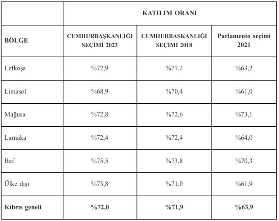 Rum haber kaynaklarından edinilen bilgilere göre, Rum Yüksek Seçim Kurulu Başkanı Kostas Konstanitu yaptığı resmi açıklamada, seçimlere katılım oranının saat 72 olduğunu belirtti.