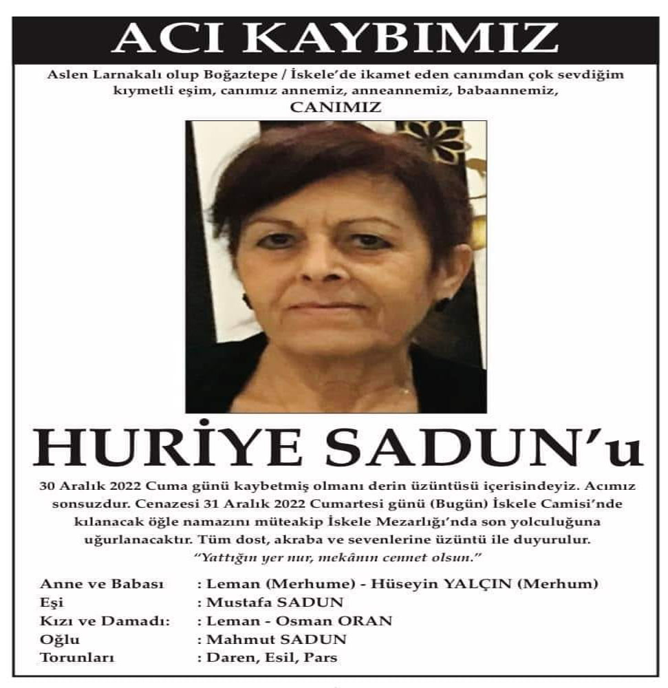 İskele'de ikamet eden Huriye Sadun yaşamını yitirdi.