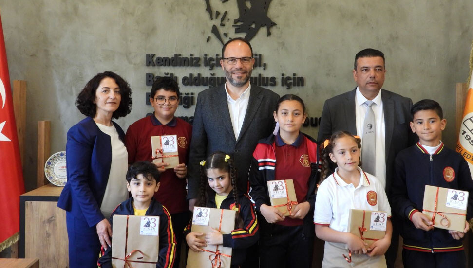 İskele ilçesi merkez okullarından öğrenciler, 23 Nisan Ulusal Egemenlik ve Çocuk Bayramı dolayısıyla İskele Belediye Başkanı Hasan Sadıkoğlu’nu ziyaret etti.